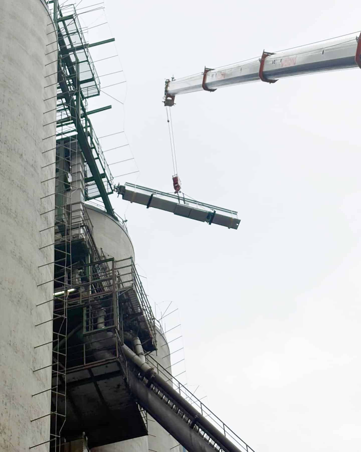 Bei einem Kunden im Rhein-Main-Gebiet haben wir zwei Trogkettenförderer in 35 Metern Höhe ausgetauscht. Wir mussten sie zwischen zwei Betonsilozellen demontieren, abladen und die neuen wieder montieren. Das war ganz schön eng und zudem hatten wir nur 48 Stunden Zeit. Also: Fehler absolut verboten! Kein Problem für unser Montageteam: Mit exakter Planung, top Ausrüstung, leistungsstarken Maschinen und ganz viel Erfahrung hat alles wie am Schnürchen geklappt.